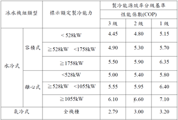 [1] 蒸氣壓縮式冰水機組容許耗用能源基準CNS12575與能源效率分級標示事項方法及檢查方式。